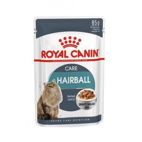 Kompletné vlhké krmivo ROYAL CANIN pre dospelé mačky. Zloženie krmiva Hairball Care pomáha vylučovať prehltnuté chlpy prirodzenou cestou.