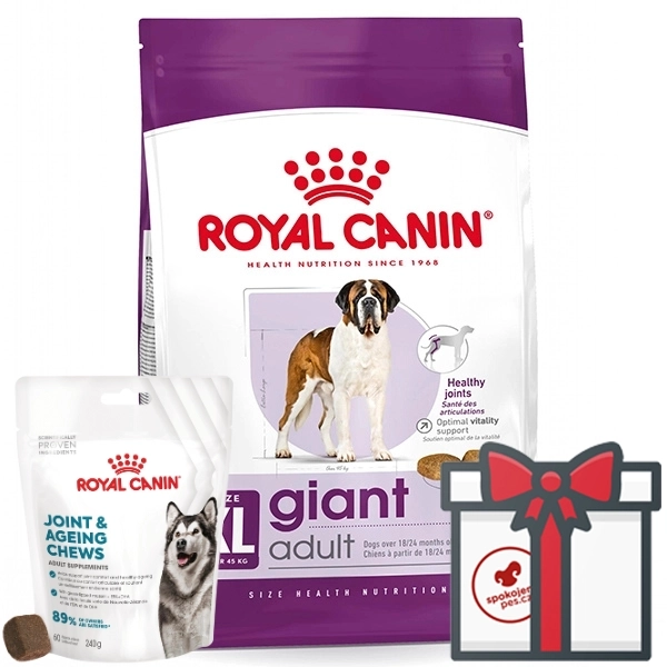 Kompletné krmivo Royal Canin Giant Adult pre dospelých psov obrích plemien (nad 45 kg) vo veku nad 18 alebo 24 mesiacov. Receptúra obsahuje jedinečnú zmes minerálov a živín a tým pomáha podporovať zdravé kosti a kĺby, ktoré sú vysokou hmotnosťou veľmi zaťažené. Zároveň pomáha podporovať srdce vďaka obsahu taurínu a je ľahko stráviteľná.