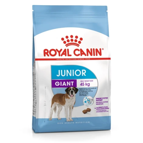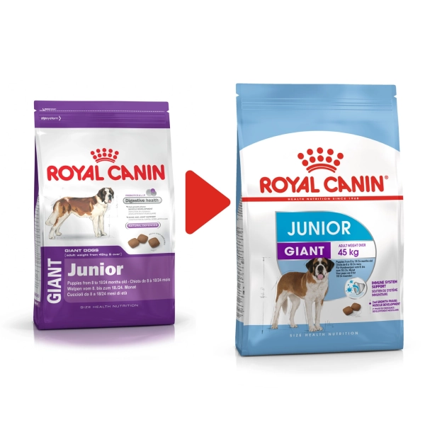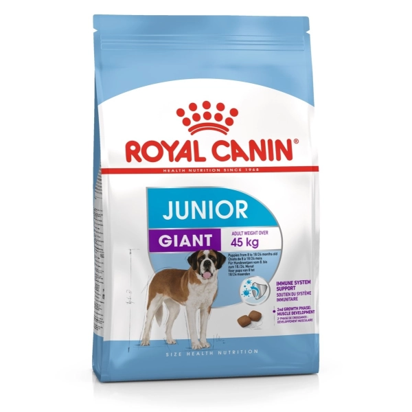 Royal Canin Giant Junior prostredníctvom optimálneho pomeru vápnika a fosforu prispieva u šteňaťa molossoidného plemena k dobrej mineralizácii a spevňovaniu kostí a kĺbov. Vhodné pre jedince vo veku 8-24 mesiacov (hmotnosť v dospelosti viac ako 45 kg). Receptúra podporuje prirodzenú obranyschopnosť vďaka komplexu antioxidantov a vitamínu E.