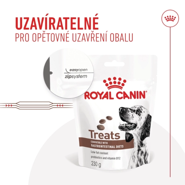 Tieto maškrty sú špeciálne vyvinuté ako bezpečný doplnok k veterinárnym diétam Royal Canin Gastrointestinal. Majú mäkkú žuvaciu štruktúru, takže sú vhodné aj pre psy s citlivým chrupom. Pri správnom dávkovaní nenarúšajú diétny plán a môžete s nimi psa odmeňovať bez obáv z podráždenia tráviaceho traktu. Vhodné pre psy od 6 mesiacov veku.