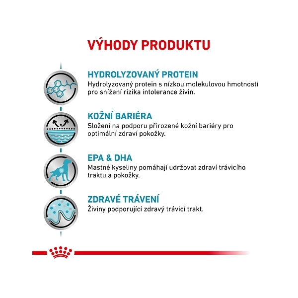 Kompletné diétne krmivo Royal Canin špeciálne vyvinuté pre psy s potravinovou intoleranciou alebo alergiou, obohatené o omega-3 mastné kyseliny pre optimálny stav kože a podporu zdravého trávenia.