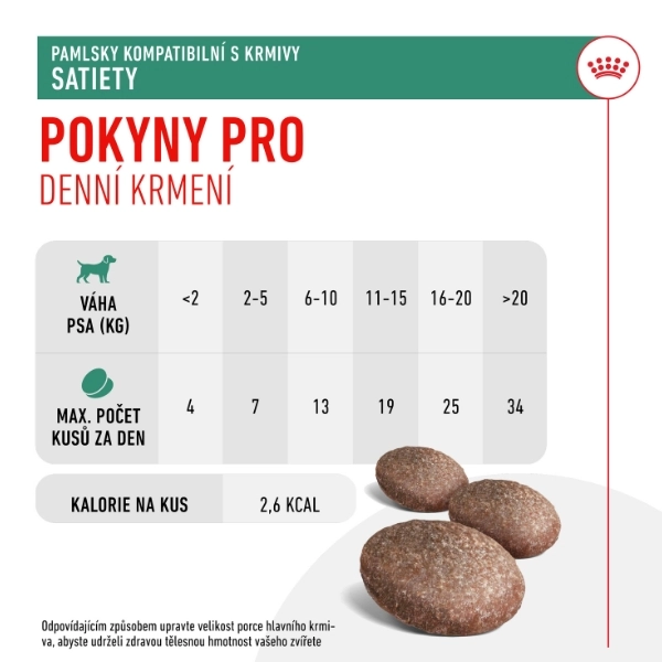 Royal Canin Satiety Treats sú funkčné pochúťky špeciálne vyvinuté pre psov s redukčnou diétou. Každý kúsok obsahuje menej ako 3 kalórie, takže sú skvelou bezpečnou odmenou pri chudnutí a udržiavaní hmotnosti. Vysoký obsah bielkovín pomáha zachovať svalovú hmotu, zatiaľ čo vláknina pomáha predĺžiť pocit sýtosti a podporuje zdravé trávenie. Pamlsky sú ideálnym doplnkom veterinárnej diéty Royal Canin Satiety a možno ich podávať dospelým psom.