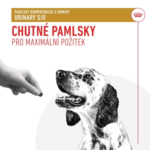 Royal Canin Urinary Treats sú mäkké žuvacie pochúťky určené pre dospelých psov na veterinárnej diéte na podporu močových ciest. Špeciálne vyvinutý obsah minerálnych látok pomáha znižovať riziko tvorby močových kameňov a pomáha udržiavať optimálne prostredie v močových cestách. Vďaka jemnému zloženiu sú tieto pamlsky vhodné ako bezpečná odmena pri močovej diéte Royal Canin bez toho, aby zaťažovali organizmus. Skvelá voľba na každodennú motiváciu a odmeňovanie citlivých alebo chorých psov.