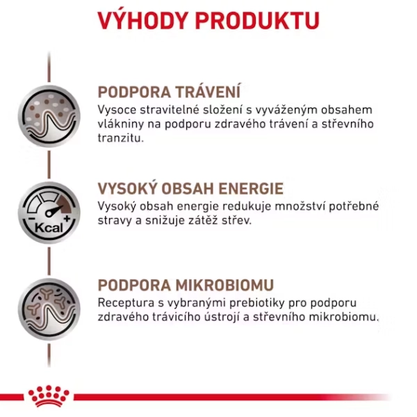 Royal Canin VD Feline Gastro Intestinal je kompletným diétnym krmivom pre mačky - mačiatka aj dospelé mačky, ktoré znižuje riziko akútnych črevných resorpčných ochorení a podporuje nutričnú obnovu a regeneráciu. Kombinácia vysoko stráviteľných proteínov (L.I.P.¨proteínov) s prebiotikami (frukto-oligosacharidy a manno-oligosacharidy), repnými odrezkami, ryžou a rybím olejom bezpečne podporujú optimálne zažívanie. Vysoký obsah energie zodpovedá energetickým požiadavkám mačiek a umožňuje podávať nižšie množstvo potravy na jedno kŕmenie. Tráviaci trakt tak nie je preťažovaný. Pomáha aj pri rekonvalescencii. Mačky trpiace tráviacimi problémami majú často zníženú chuť príjmu potravy a chudnú. Dobrá chutnosť krmiva podporuje jeho spontánny príjem a urýchľuje tak rekonvalescenciu a uzdravenie. Kyselina eikosapentánová a dokosahexánová, mastné kyseliny s dlhým reťazcom (omega 3), prispievajú k dobrému stavu tráviaceho systému.