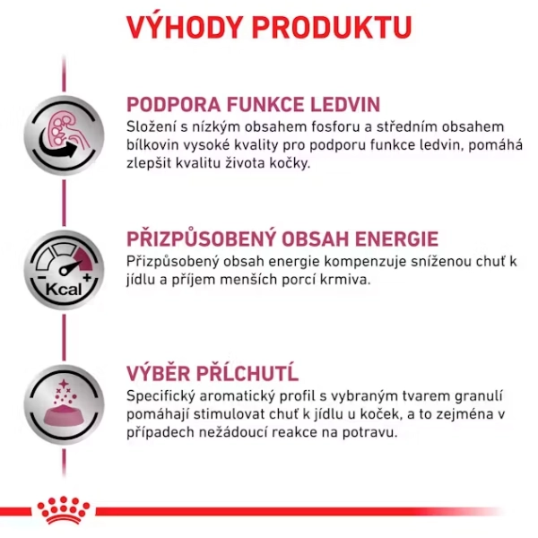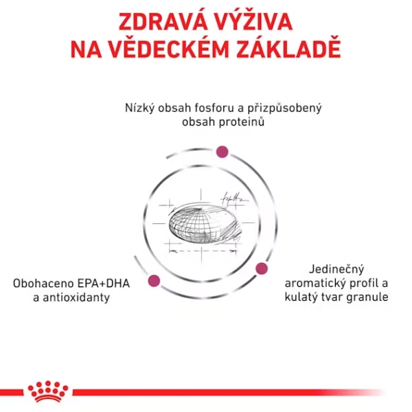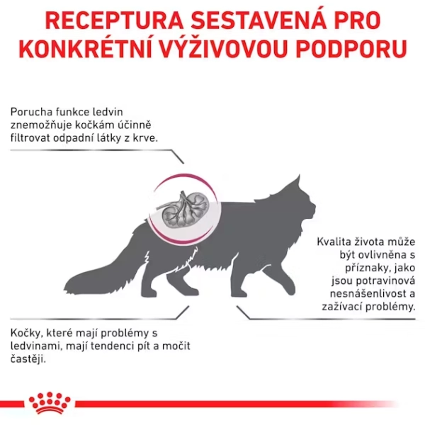 Royal Canin VD Feline Renal je veterinárna diéta, ktorá podporuje funkciu obličiek v prípade chronického alebo akútneho zlyhania činnosti obličiek, a to vďaka nízkemu obsahu fosforu.