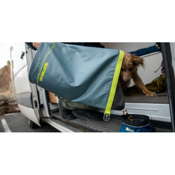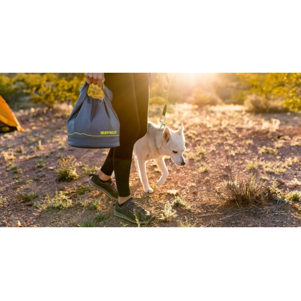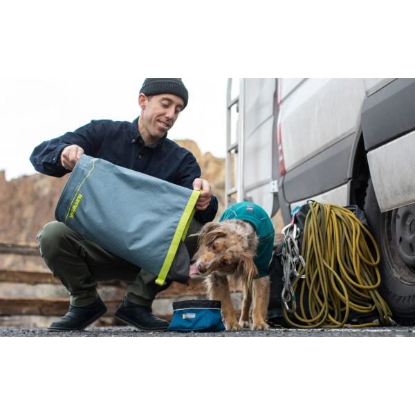 Už žiadne vysypané granule v kufri. Cestovný dávkovač krmiva Ruffwear Kibble Kaddie udržiava granule úhľadne pohromade a na jednom mieste. Skvelá voľba pre skladnú prepravu, bezpečné skladovanie a pohodlné dávkovanie krmiva. Rolovací uzáver chráni voňavý obsah pred vysypaním a zvedavými ňufákmi. Vyrobené z tkaniny odolnej voči mastnote.