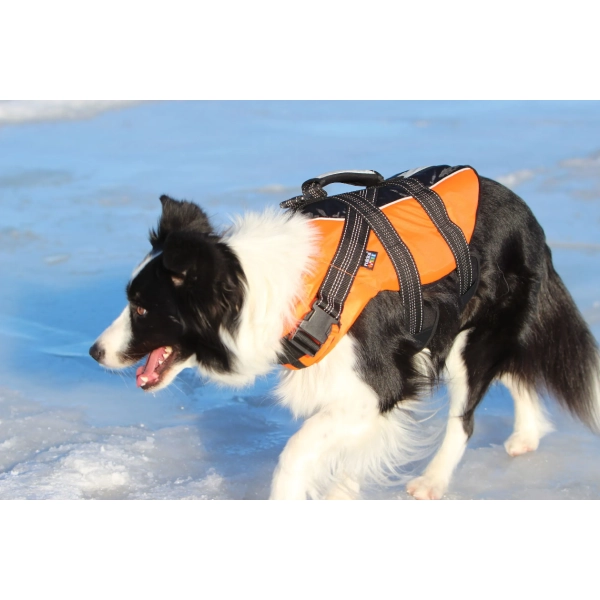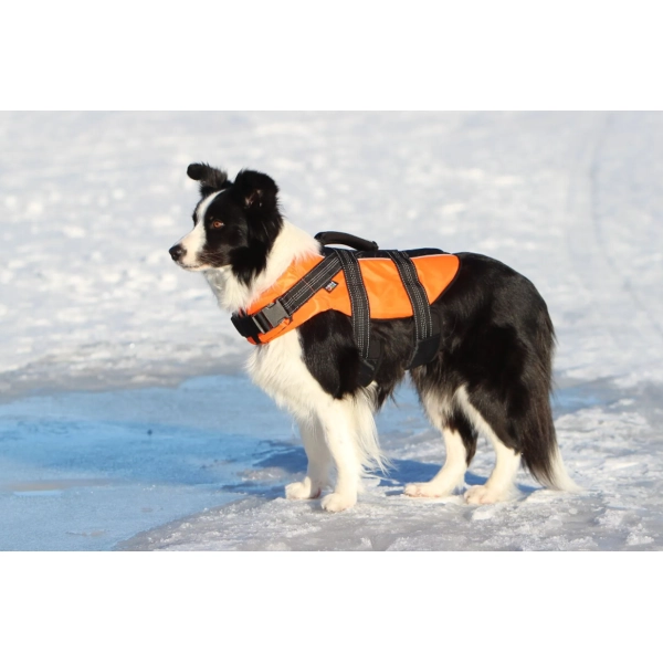 Upozornenie: Plávacia vesta je v skutočnosti tmavšieho odtieňa oranžovej, viď reálne fotky na psoch v galérii.