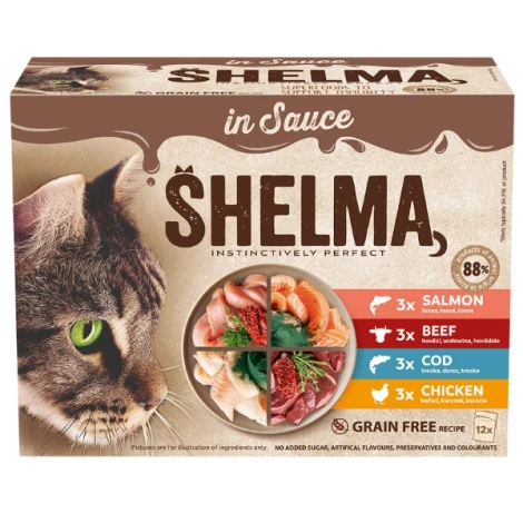 Shelma Cat Multipack GF – dusené filety mäsové a rybie receptúry je kompletné vlhké bezobilné krmivo pre dospelé aj kastrované mačky. Obsahuje štyri druhy chutných filetiek v omáčke – s hovädzím, kuracím, lososom a treskou, ktoré spoločne zabezpečujú pestrú a vyváženú stravu. Vysoký podiel živočíšnych zložiek a doplnok spiruliny, paradajok a byliniek podporuje vitalitu, silnú imunitu a zdravé trávenie.