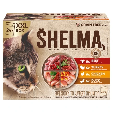 Shelma Cat Multipack GF dusené filety mäsové receptúry je kompletné vlhké bezobilné krmivo pre dospelé aj kastrované mačky. Obsahuje štyri druhy chutných filetiek v omáčke – s hovädzím, kuracím, morčacím a kačacím mäsom, ktoré spoločne zabezpečujú pestrú a vyváženú stravu. Vďaka vysokému podielu živočíšnych zložiek a doplnku rakytníka, paradajok a byliniek podporujú vitalitu, silnú imunitu aj zdravé trávenie.
