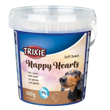 Soft Snack Happy Hearts - kýblik plný lahodných srdiečok! Odmeňte svojho maznáčika milou odmenou. Mäkká srdiečka s jahňacím mäsom a ryžou, bez pridaného cukru. Pochúťky sú v vedierka, ktorý opäť uzavriete a uchováte tak čerstvosť a chutnosť odmien. Obsah 500 g.