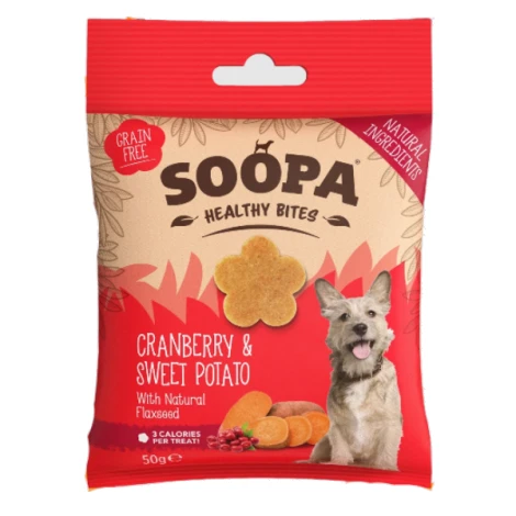 Prírodné vegánske pochúťky pre psov Soopa Healthy Bites s brusnicami a sladkými zemiakmi, ktoré rozveselia psie oči a potešia ich brušká. Vhodné na tréning alebo ako zdravá maškrta kedykoľvek počas dňa. Hypoalergénne, s nízkym obsahom tuku a bez obilnín, vhodné pre psy s citlivým trávením.