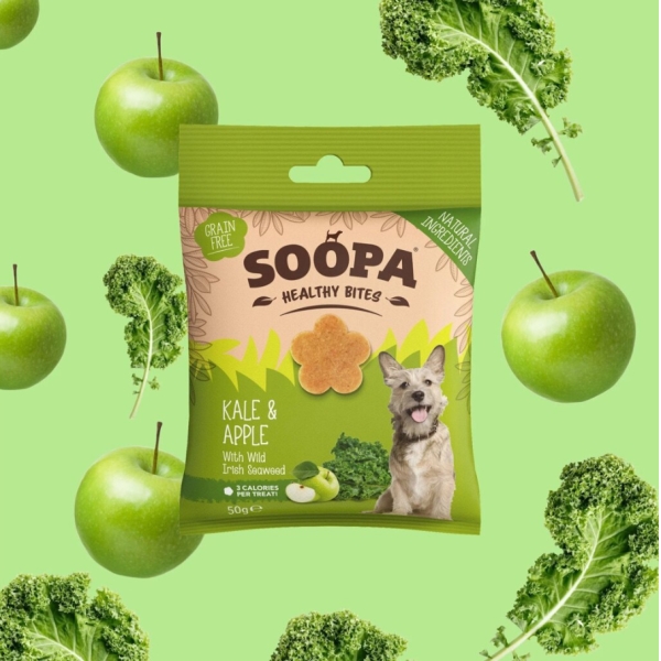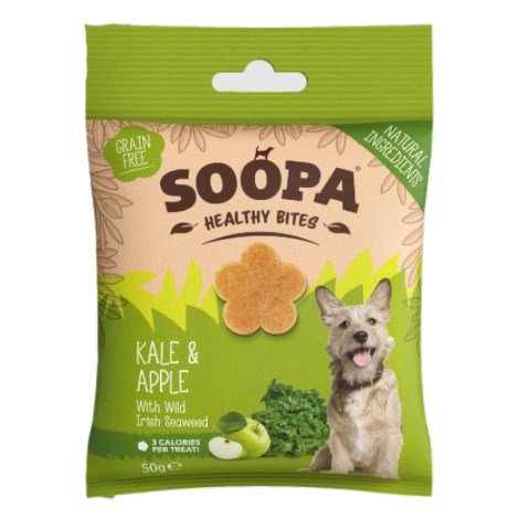 Prírodné vegánske pochúťky Soopa Healthy Bites s kelom a jablkom sú hypoalergénne a ľahko stráviteľné pochúťky pre psy všetkých plemien, ktoré môžete použiť na tréning alebo na veselý večerný olovrant. Ich výživová hodnota prospieva celkovému zdraviu a sú vhodné pre alergikov, citlivé brušká a psy na nízkobielkovinovej diéte.