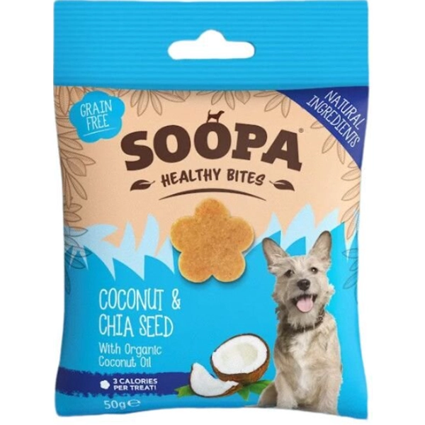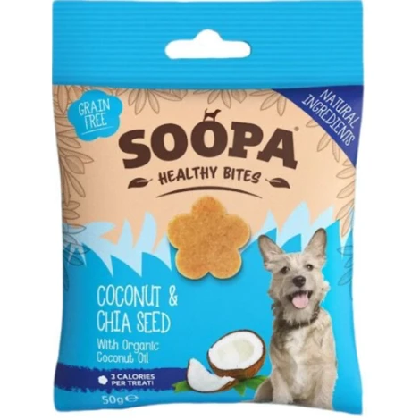 Všetky zložky v pochúťkach Soopa pochádzajú z rovnakých zdrojov ako tie určené na ľudskú spotrebu. Kokosový olej pôsobí protizápalovo, detoxikačne a pomáha udržiavať zdravú srsť, kožu a pazúry. Chia semienka sú bohaté na omega 3 mastné kyseliny, vápnik a železo. Pomáhajú upravovať hladinu cukru v krvi a udržiavať správnu hladinu elektrolytov.
