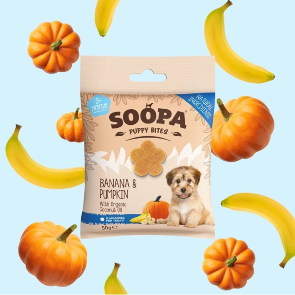 Prírodné vegánske pochúťky Soopa Healthy Bites Puppy s banánom a tekvicou sú hypoalergénne a ľahko stráviteľné pochúťky pre šteňatá od 3 mesiacov, ktoré môžete použiť na výcvik alebo na veselý večerný olovrant. Ich výživová hodnota prospieva celkovému zdraviu a vďaka vyššiemu obsahu cíceru sú mäkšie ako ostatné pochúťky Soopa, takže sa ľahšie žuvajú a trávia. Vhodné pre alergikov, psy s citlivým bruškom a psy na diéte s nízkym obsahom bielkovín.