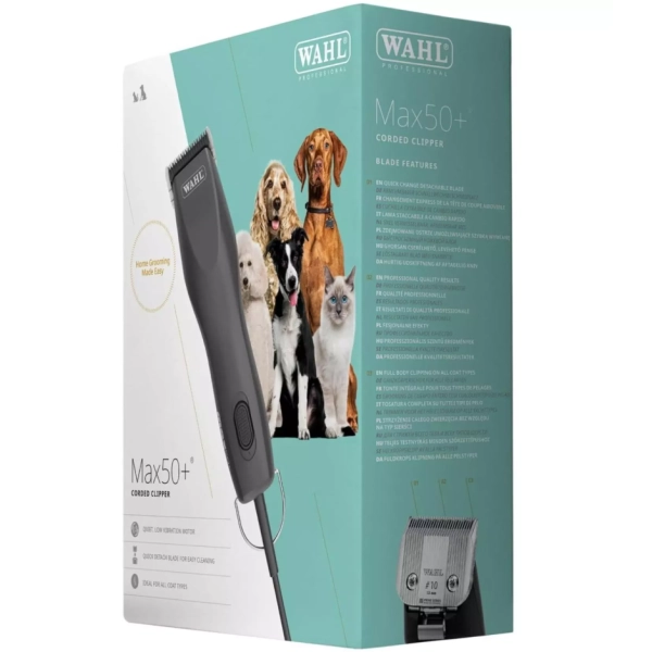 Profesionálny zastrihávač psov Wahl Max 50+ pre všetky typy srsti. Vďaka výkonnému dvojrýchlostnému motoru, mimoriadne tichej prevádzke a ergonomickému, ľahkému tvaru je ideálny na zastrihávanie srsti po celom tele. Ideálna voľba pre citlivých chlpáčov, ktorí sa v strihaní príliš nevyžívajú.