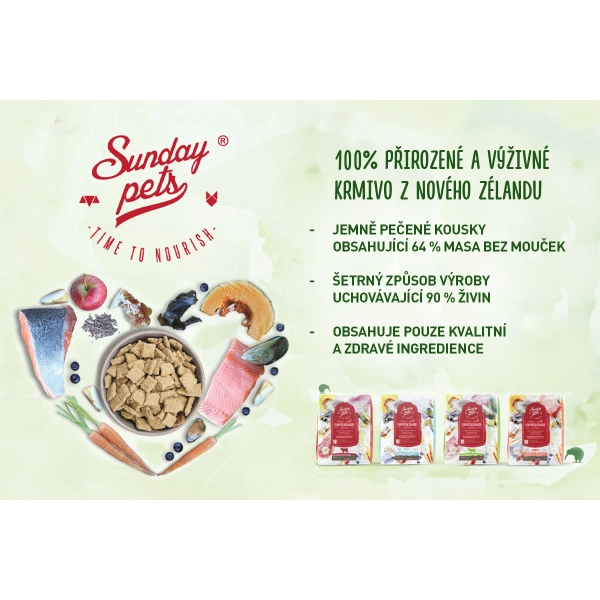 Láska na prvé ochutnanie. Kompletné a jemne pečené krmivo pre dospelé psy malých a stredných plemien Sunday Pets Salmon Adult with King Salmon z Nového Zélandu kombinuje 100 % kvalitného mäsa, veľa zeleniny a ovocia. Bez obilnín, plné živín a poctivých ingrediencií.
