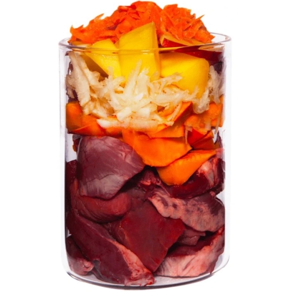 Mäso 54 %, zelenina, ovocie a bylinky 42 %, ostatné suroviny 4 %.