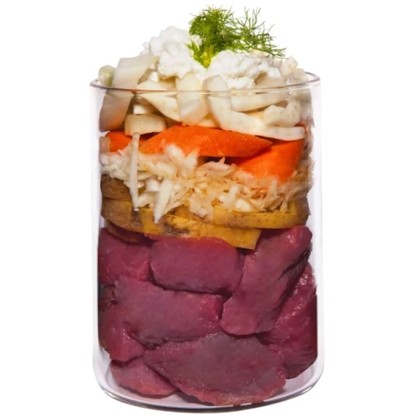 Teľacia svalovina 50 %, mrkva 14 %, teľacie pľúca 10 %, zemiaky 9 %, fenikel 8 %, zeler 4 %, tvaroh 3 %, fenikel, kokosová múka 1 %, ustricové mušle*, minerálny íl* 0,5 %, harmanček* 0,5 %, nechtík lekársky* 0,3 %, andská soľ 0,2 %, olej z čiernej rasce 0,2 %, morské riasy*.