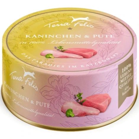 odstrániťKeď sa otvorí Terra Felis, aj tie najvybieravejšie mačky si prídu na svoje. 90 % mäsa, výnimočná chutnosť a len ľudská kvalita. Žiadne triky ani umelé vône. Konzervy pre mačky Terra Felis s králikom a morčacím mäsom prinášajú vašej mačke kompletný nutričný profil čistého mäsožravca v absolútne opojnej receptúre.