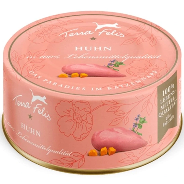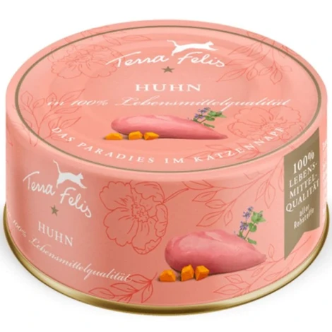 Terra Felis chicken - kompletné krmivo pre mačky, ktoré odráža prirodzené potreby mačky ako čistokrvného mäsožravca. Vynikajúca čerstvosť a kvalita surovín sa odráža vo výnimočnej chuti a vôni. Zásoba bielkovín pre energiu, vláknina pre spokojné bruško a kvapka repkového oleja spolu vytvárajú dokonalú receptúru, vďaka ktorej si aj tá najvyberavejšia mačka všimne prvé olizovanie.