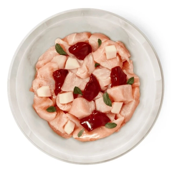 Kuracie srdce 30 %, kuracie žalúdky 26 %, kuracia koža 14 %, kuracia svalovina 10 %, kuracia pečeň 10 %, maslová tekvica 4 %, paradajkový prášok, repkový olej, mačacia mäta*, minerálne látky.