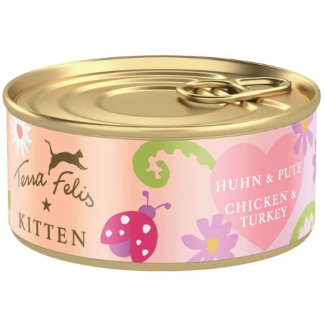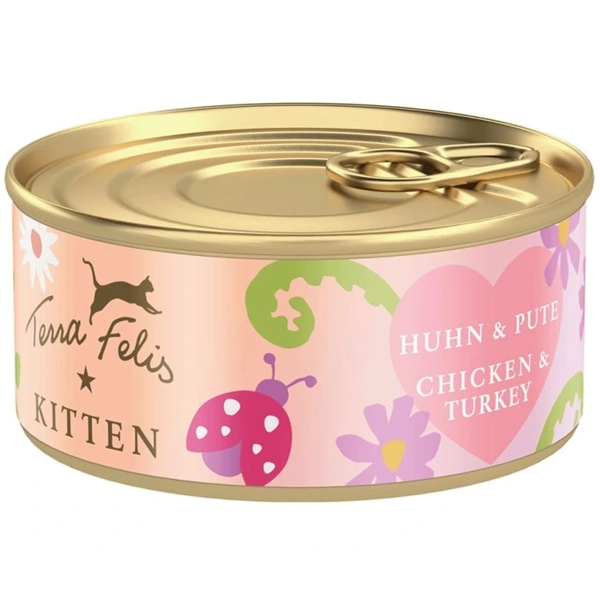 Súprava pre mačiatka. Konzerva pre mačiatka Terra Felis Chicken and Turkey ponúka všetko, čo mačiatka potrebujú pre zdravý štart do života - vysoký obsah živočíšnych bielkovín, dostatok energie, esenciálnych aminokyselín a živín spolu s dokonalou chuťou a vôňou z prírodných surovín. Kompletné krmivo bez obilnín, vyrobené zo 100 % kvalitných skutočných potravín.