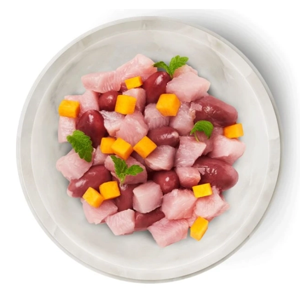 Kuracie žalúdky 20 %, kuracia koža 20 %, kuracia pečeň 15 %, kuracie srdce 10 %, morčacia svalovina 10 %, morčacie žalúdky 10 %, kuracia svalovina 5 %, tekvica 4 %, paradajkový prášok*, repkový olej, rybí tuk, mačacia mäta*, minerálne látky.