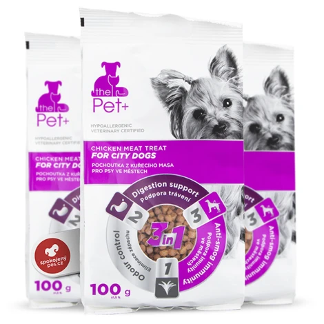 The Pet + Dog City Treat sú drobné maškrty pre mestské chlpáča! Zloženie sa zameriava na posilnenie prirodzenej imunity a zníženie zápachu exkrementov. Výborná chuť, ktorej dominuje hydinové a rybie mäso s králičími vnútornosťami.