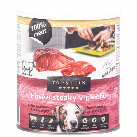 Vysoko kvalitná, ručne plnená konzerva Topstein Hovädzie steaky v plechu. Bez obsahu vedľajších produktov, obilnín, farbív, konzervantov a sóje. Konzerva je extrémne chutná a vysoko stráviteľná.