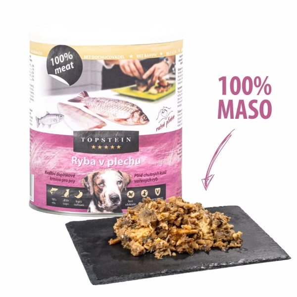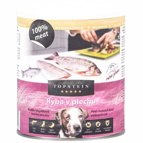 Topstein konzerva Ryba v plechu je kompletné mokré krmivo pre psy všetkých plemien aj vekových kategórií. Jedná sa o poctivú konzervu s kúskami rýb, ktorá obsahuje len živočíšne bielkoviny. Naopak neobsahuje obilniny, sóju, dochucovadlá ani konzervanty.