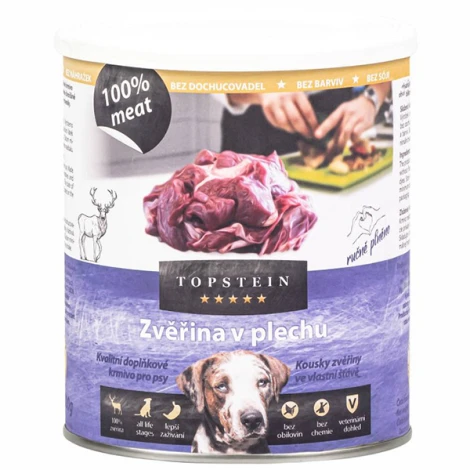 Vysoko kvalitná, ručne plnená konzerva Topstein Zverina v plechu. Bez obsahu vedľajších produktov, obilnín, farbív, konzervantov a sóje. Konzerva je extrémne chutná a vysoko stráviteľná. Obsahuje viečko pre udržanie dlhšiu čerstvosti.