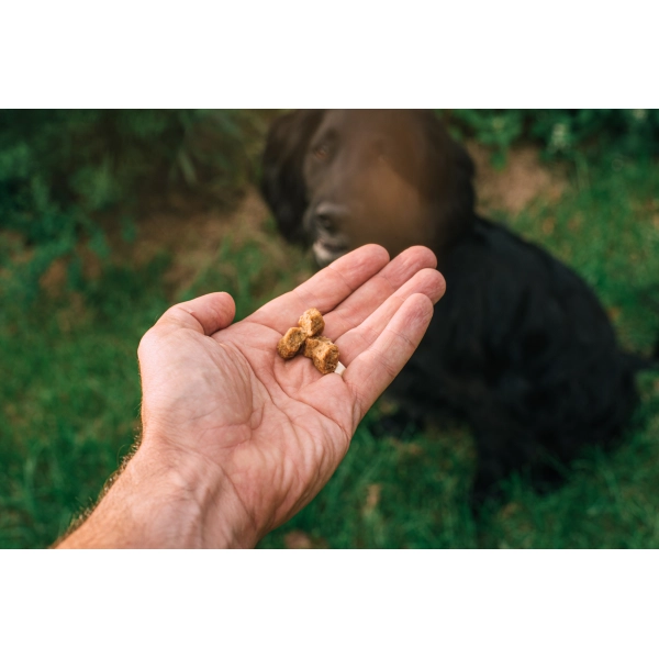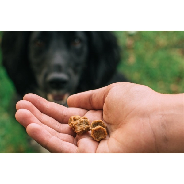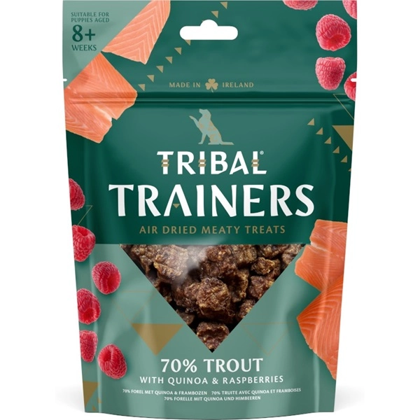 Či už skúšate nové skvelé triky, vyššiu úroveň poslušnosti alebo správny výcvik šteňaťa, za ktorý sa nebudete musieť hanbiť, máme pre vás tréningové pochúťky Tribal Trainers Trout & Raspberry, ktoré vám splnia vaše želanie. Mäkké, šťavnaté a veľmi chutné pochúťky s čerstvým pstruhom a malinami sa spoliehajú na úplne prírodné zložky a vysoký obsah mäsa, ktoré neodmietne žiadny chlpatý priateľ. Vďaka šetrnému sušeniu pri nízkych teplotách sú odmeny nutrične bohaté, ľahko stráviteľné a vhodné aj pre citlivé brušká.