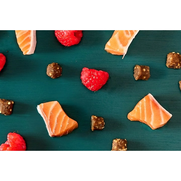 Pstruh 70 %, zemiaky, rastlinný olej, glycerín, quinoa 4 %, maliny 4 %, fermentovaná srvátka, minerálne látky, šalvia. Antioxidanty: výťažky tokoferolu z rastlinných olejov.