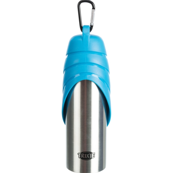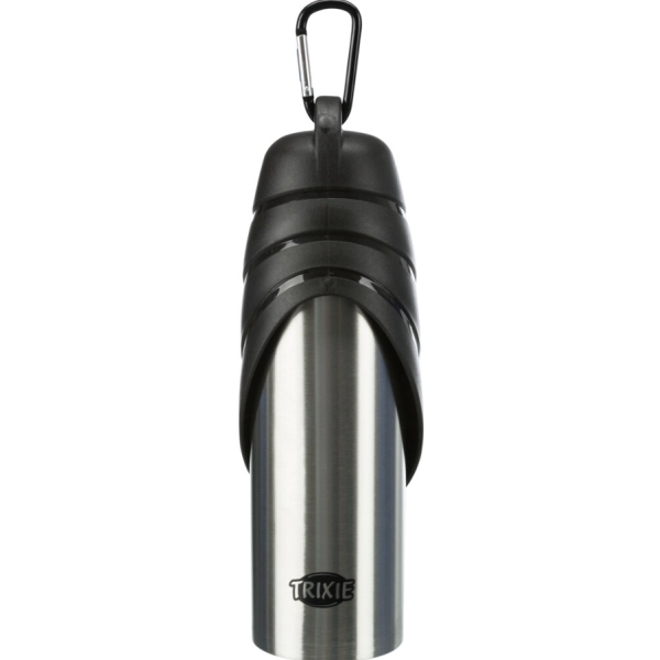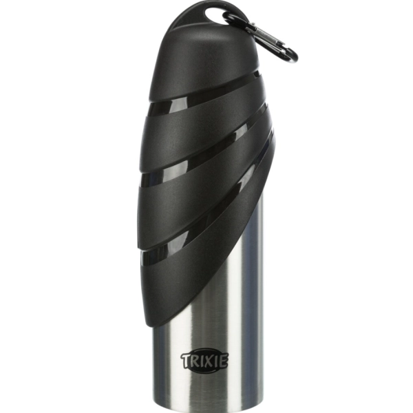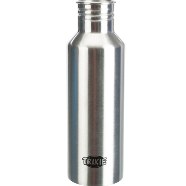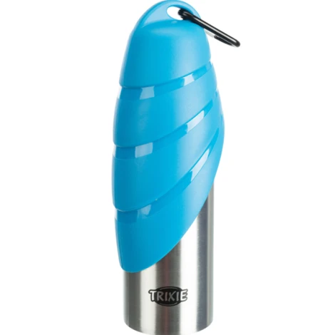 Cestovná fľaša Trixie pre psa s plastovou miskou na jednoduché kŕmenie a rýchle čistenie vďaka širokému hrdlu. Odolná fľaša z nehrdzavejúcej ocele pomôže udržať pitný režim vášho chlpáča počas dobrodružných túr a dlhších ciest autom alebo vlakom.