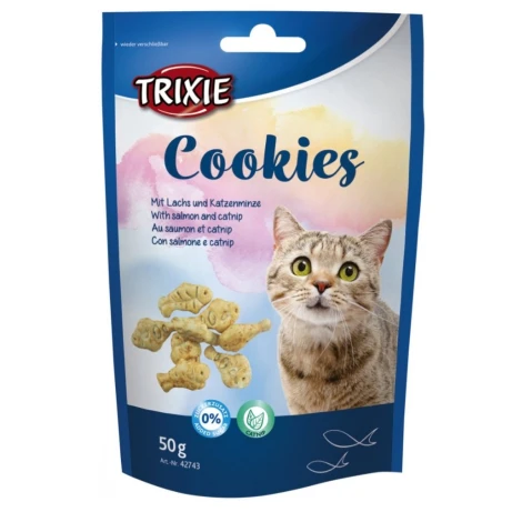 Ryba, catnip a chrumánie. Perfektná kombinácia, ktorá vašu mačku skutočne poteší. Maškrty Trixie Cookies s lososom a catnipom sú pečené, v tvare rybičiek a skvele vonia. Čo viac si od maškŕt priať?