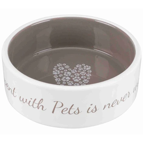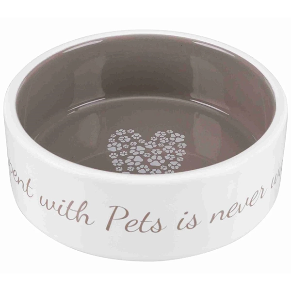 Štýlová keramická miska z kolekcie Pet's Home poteší každého chlpáča aj jeho majiteľa. Elegantný hnedosivý tón dopĺňa motív srdca a nápis, ktorý dodáva miske osobitý šmrnc. Využijete ju na vodu aj krmivo a vďaka odolnej glazúre ju ľahko umyjete aj v umývačke.