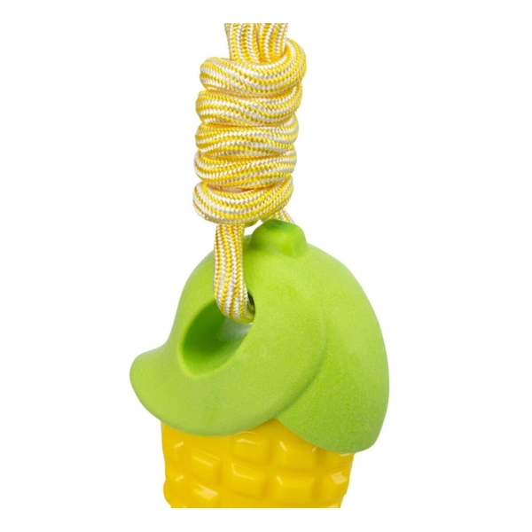 Trixie kukuričný klas na lane so zvukom poteší všetkých psov, ktorí neodmietnu žiadnu zábavu. Užite si hru na preťahovanie lanom, hádzanú alebo aportovanie so svojím chlpáčikom. Gumená kukurica obsahuje pískatko, ktoré upúta pozornosť vášho psa a zabaví ho počas hry.
