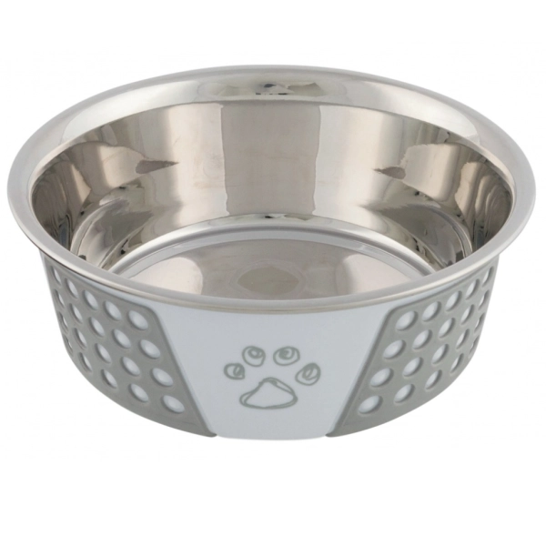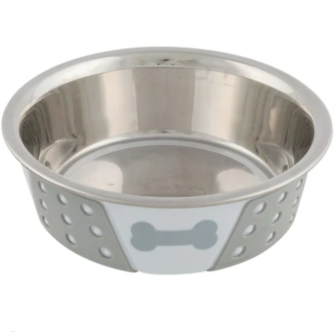 Trixie nerezová miska so silikónovým plášťom je hygienická a ľahko umývateľná miska, ktorá sa nešmýka v ruke a neposúva sa pri kŕmení po podlahe. Z boku misky je obrázok kosti alebo labky. Miska je vhodná pre malé psy.