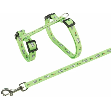 Pohodlný nylonový postroj pre zajačika s rýchloupínaním, doplnený o motív králikov s mrkvami. Postroj je nastaviteľný cez hrudník a balenie obsahuje vodítko.