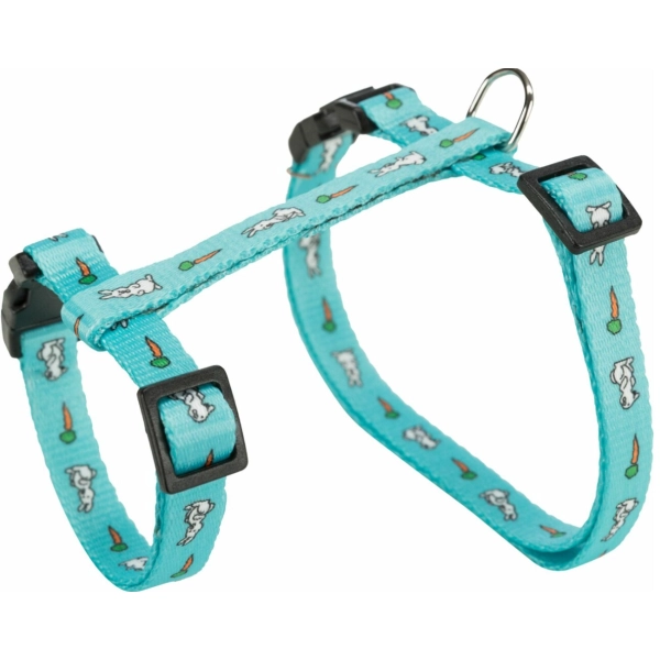odstrániťPohodlný nylonový postroj pre zajačika s rýchloupínaním doplnený o motív králikov s mrkvami. Postroj je nastaviteľný cez hrudník a balenie obsahuje vodítko.