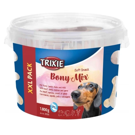 Maxi balenie obľúbených kociek Bony Mix od Trixie. Báječná odmena pre vášho psa! V balení nájdete 4 rôzne príchute maškŕt, a to hovädzie, kuracie, jahňacie a losos. Bez pridaných cukrov! Znovu uzatvárateľné vedro udrží maškrty čerstvé.