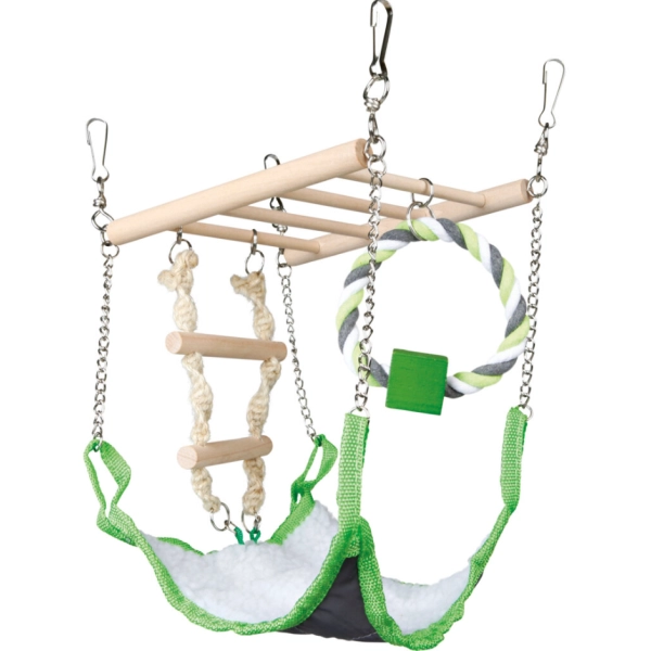 Závesné ihrisko a mäkký pelech s lanom a dreveným rebríkom od Trixie si zamiluje každý malý hlodavec. Všetko je robustné, rebríky sú vyrobené z prírodného materiálu a celé ihrisko sa dá jednoducho pripevniť ku klietke.