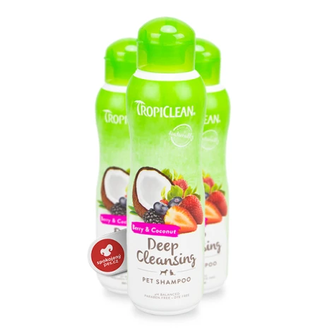 Jemný a záreveň veľmi účinný šampón Tropiclean Deep Cleaning s lesnými plodmi a kokosom. Srsť bude po použití šampónu hebká, mäkká a nádherne prevoňaná.