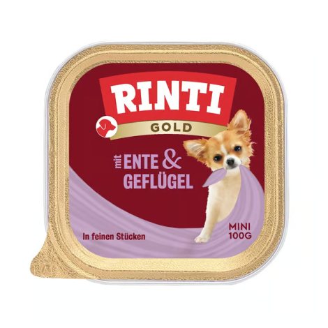 Jemná paštéta Rinti Gold s kačacím a hydinovým mäsom. Kompletné krmivo pre dospelých psov malých rás.