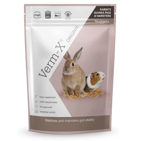 Verm-X proti črevným parazitom pre hlodavce vytvára v črevách špecifické prostredie, ktoré bráni prichyteniu črevných parazitov. Jedná sa o granulky, ktoré zlepšujú celkové zdravie, napomáhajú k črevnej hygiene a správnemu fungovaniu trávenia. Zloženie je čisto prírodného charakteru a je veľmi šetrné k tráviacej sústave hlodavcov a zajacovcov. Granulky môžu byť pridávané do kŕmnej dávky alebo podávané samostatne ako maškrty. Prípravok je vhodný pre všetky vekové kategórie malých cicavcov, ktoré sú chované v interiéri, ale aj exteriéri.
