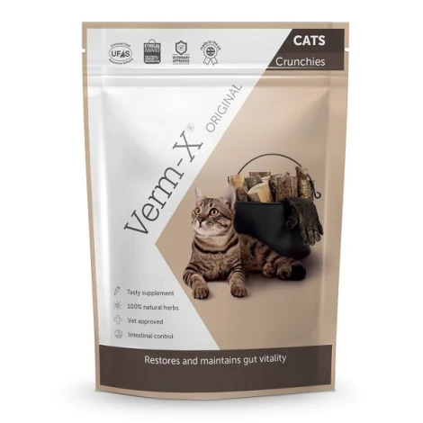 Verm-X proti črevným parazitom pre mačky vytvára v črevách špecifické prostredie, ktoré zabraňuje uchyteniu črevných parazitov. Ide o granuly, ktoré pomáhajú hygiene čriev a ich správnemu fungovaniu. Zložky sú čisto prírodného charakteru a sú veľmi šetrné k tráviacemu systému mačky. Granulky majú vysokú chutnosť a môžu sa pridávať do kŕmnej dávky alebo podávať samostatne ako pochúťka. Výrobok je vhodný pre všetky vekové kategórie mačiek vrátane tých s nadváhou.