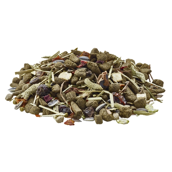 Vedľajšie produkty rastlinného pôvodu (timotejka lúčna, trávy a byliny 23 %), zelenina (zelený hrach 14,6 %, mrkva 5,9 %, červená paprika 2,8 %), ovocie, semená, minerálne látky, rastlinné bielkovinové extrakty, oleje a tuky, FOS, nechtík, MOS, riasy, juka.