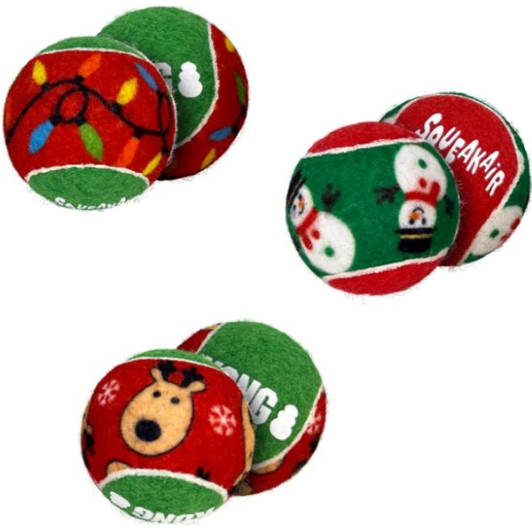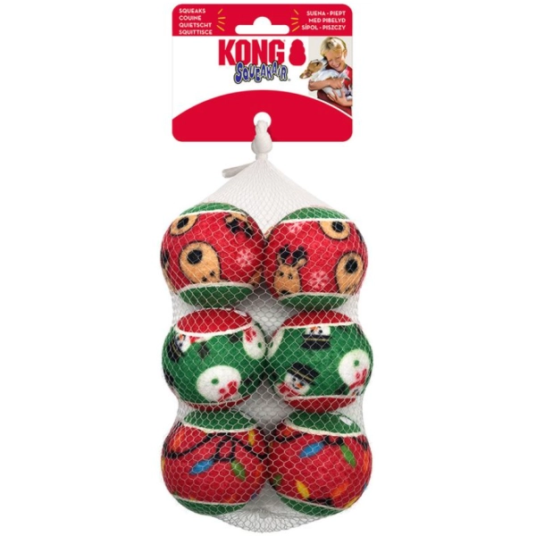 Tenisák pre fajnšmekrov. Vianočná loptička Kong SqueakAir s krásnym vianočným motívom osvieži hernú výbavu každého milovníka loptičiek. Kvalitný a odolný materiál je šetrný k zubom a ďasnám a vnútorné pískadlo podporí hravú náladu a radosť z hry.