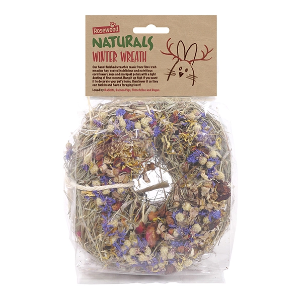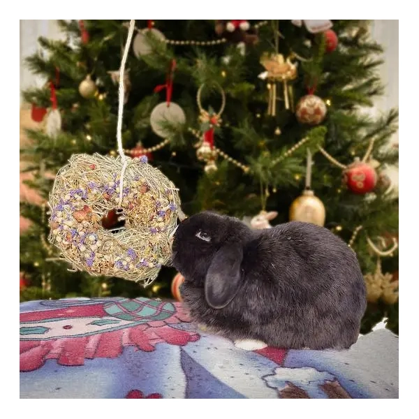 Pretože Vianoce chutia najlepšie, keď si ich všetci užijú. Vianočná pochúťka z ružového dreva je ručne vyrobený senný veniec pre králiky a hlodavce. Lúčne seno, prirodzene bohaté na vlákninu, je obalené lístkami chrpy, ruže a nechtíka a zľahka posypané jemným kokosom.
