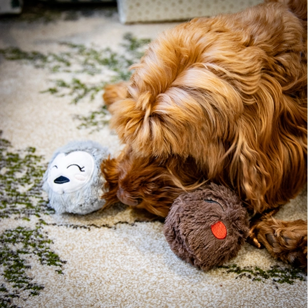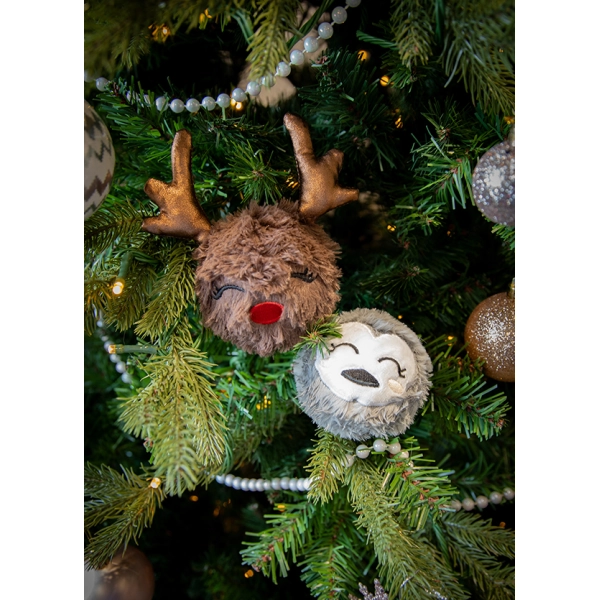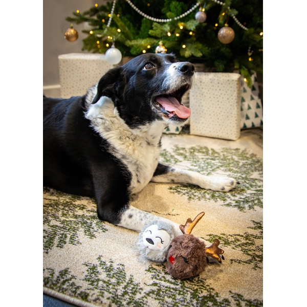 Vianočné loptičky Sob a tučniak od spoločnosti Rosewood sú skvelou hračkou pre neposedné postavičky. Kombinácia mäkkého plyšu a robustnej tenisovej loptičky s pískatkom osvieži klasickú loptovú zábavu a podčiarkne vianočnú atmosféru. Vďaka plyšovému povrchu nebude dochádzať k škrípaniu zubami, ako to môže byť pri bežnej tenisovej loptičke.